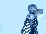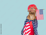 Cute brown puppy, Superhero costume and American Flag. Close-up, indoors. Studio shot. Congratulations for family, loved ones, friends and colleagues. Pets care concept