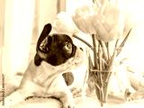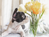 Cute puppy and bright bouquet of tulips on the windowsill in the rays of sunlight. Studio shot. Clear, sunny day. Close-up, indoors. Day light. Concept of care and training pets