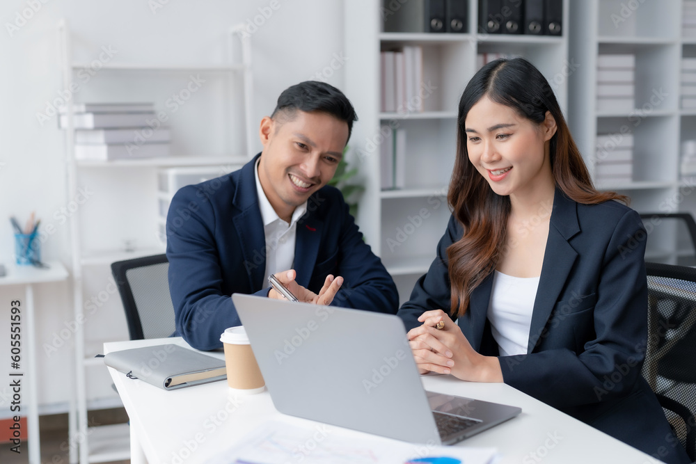 Asian businesswoman and businessman using laptop to discuss and consultation together at meeting. Collaboration of two Asian employees. Two people working in modern office.