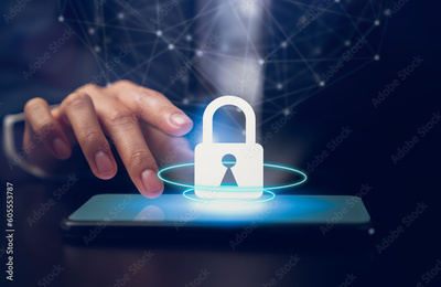 Businessman holding smartphone and hand touching icon digital padlock icon with online internet authorized access, Cyber Security of network. Innovation technology concept.