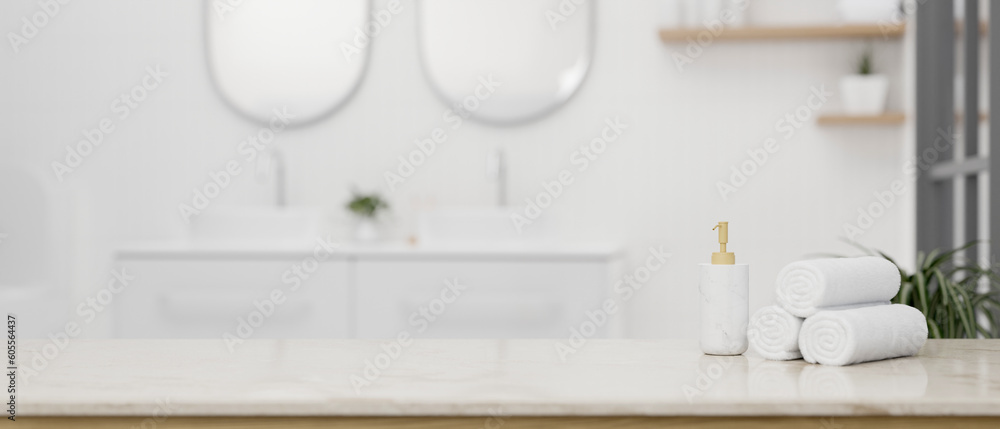 Empty space on a luxury white tabletop in a luxury white bathroom with double sink