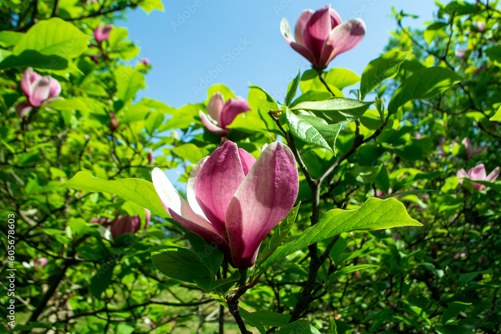 Magnolia Rose Marie flower on a branch with green leaves close up