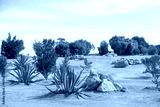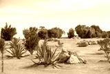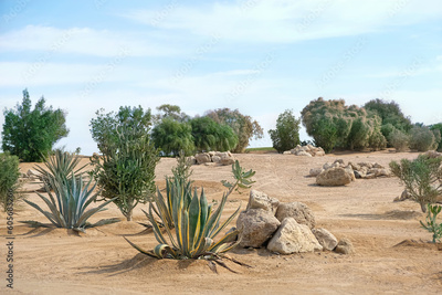 Large Agave succulent plants and trees in sands desert, natural abstract background. typical arid climate landscape for african, american, Mexic, arabic land. nature reserve area. hot sunny weather.