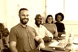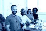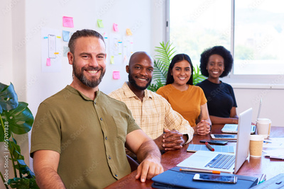 Portrait of hipster white man with beard, four colleagues boardroom meeting