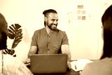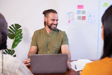 White male developer with ponytail smiles at boardroom table meeting, laptop