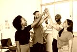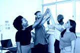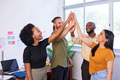 Four diverse team members give high five, celebrate success in creative office