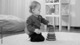 Little 1 year old baby boy sitting on floor and building colorful toy tower. Baby development, family playing games, making first steps, parenthood and care