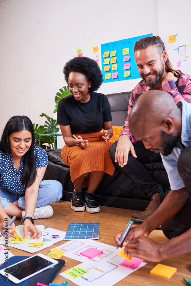Scrum team brainstorms for mobile app idea, UX design and planning development