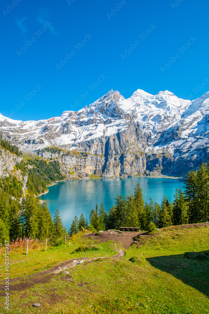 Amazing tourquise Oeschinnensee with waterfalls and Swiss Alps, Kandersteg, Berner Oberland, Switzerland.