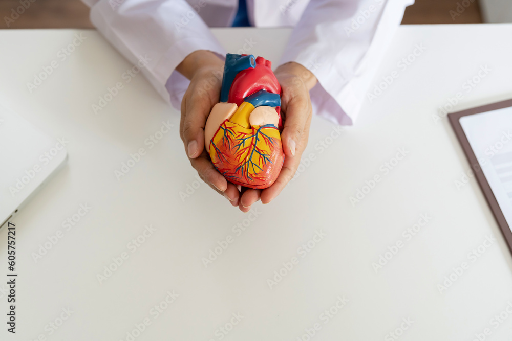 Heart transplantation concept, Doctor hold heart model at clinic.