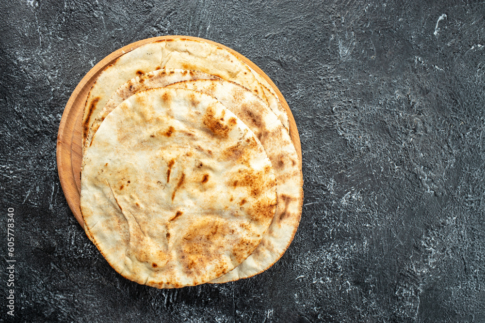 soft baked pita flatbreads, tortillas, bread. anner, menu, recipe place for text, top view