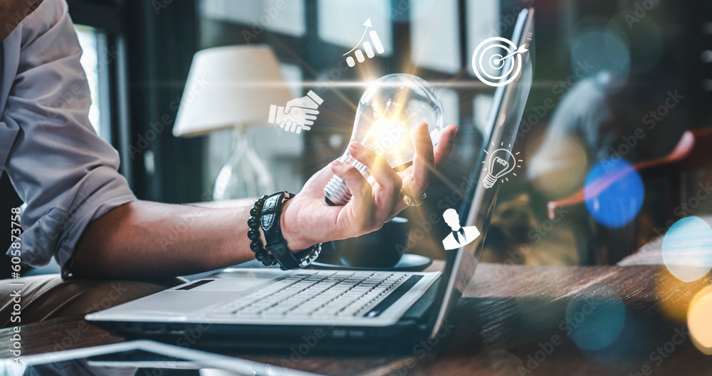 lightbulb, idea, strategy, creativity, information, network, knowledge, solution, imagination, creative. businessman hold the lightbulb and icon idea strategy creativity showed. imagination creative.