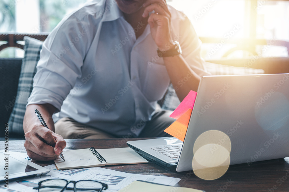 smartphone, laptop, wireless, information, communication, network, technology, digital, connection, calling. a man is calling with smartphone and writing note around that's has laptop. information.