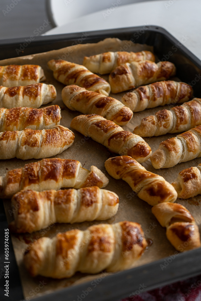 Baked uff pastry buns with pear on a baking sheet on the kitchen table at home