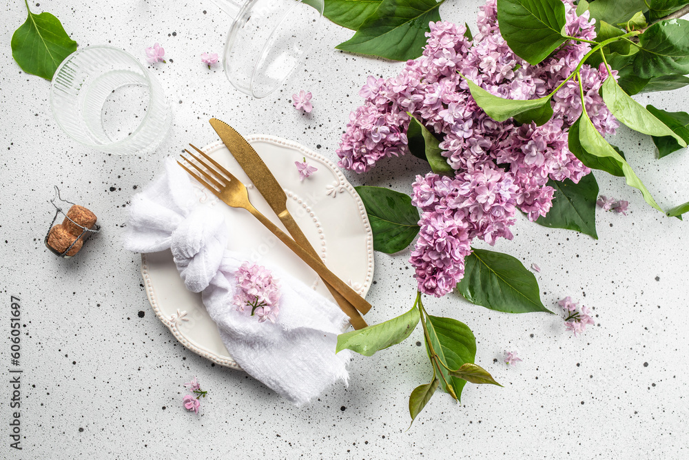 table setting dinner with lilac flower. Summer celebration, wedding greeting card, invitation concept