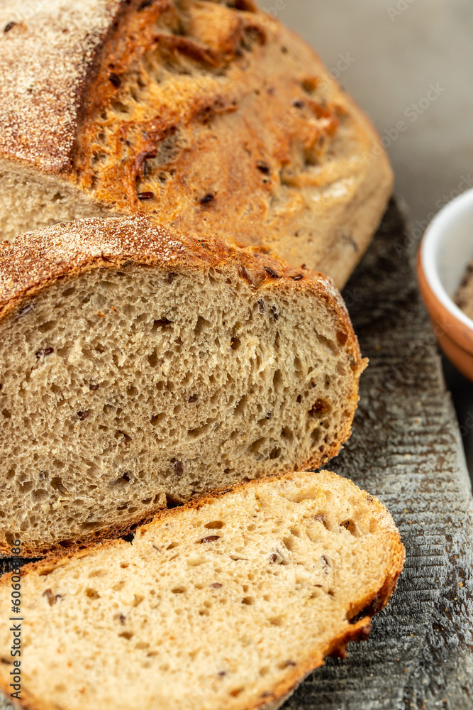 Fresh bread with seeds, sesame cut into pieces on a cutting board. vertical image. top view. place for text