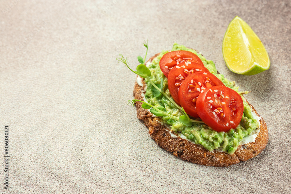 Fresh green Avocado sandwich on dark rye bread made with fresh sliced tomatoes and lime. place for text, top view