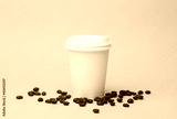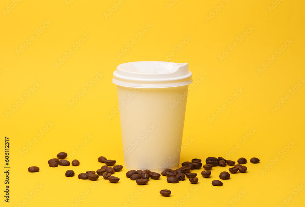 Take-out white cardboard coffee cup with lid and coffee beans on yellow background
