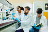 Group of scientists analyzing liquid in beaker while working on medical research in laboratory.