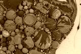 Bubbles popping in acrylic pouring of oil and blue gold orange and white paints in abstract background asset
