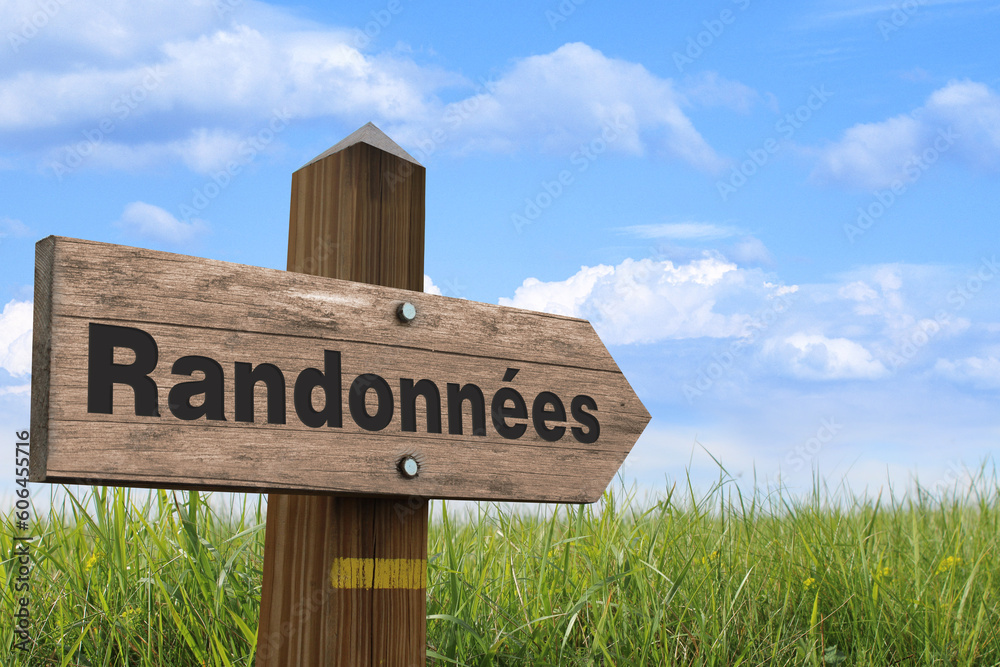 Panneau en bois, signalisation des circuits de randonnées avec balisage jaune, arrière plan nature et ciel bleu.