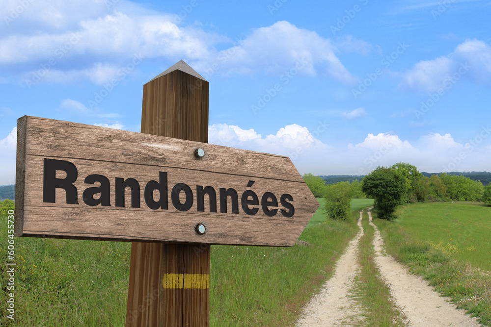 Panneau en bois, signalisation des circuits de randonnées avec balisage jaune, arrière plan nature et ciel bleu.