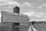 Panneau en bois, signalisation randonnée avec balisage jaune, espace vide pour du texte, arrière plan nature et ciel bleu.
