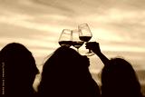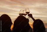The girls arranged a picnic at sunset. Picnic in the fresh air with wine. Close-up of the girls' hands as they clink glasses with wine.