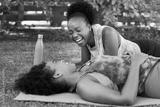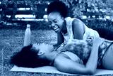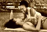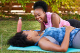 Two young Black women laugh and relax after yoga in the park, friendship summer