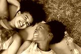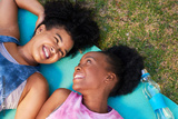 Two young Black women lie on yoga mat after exercise in park, relaxing talking