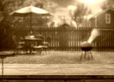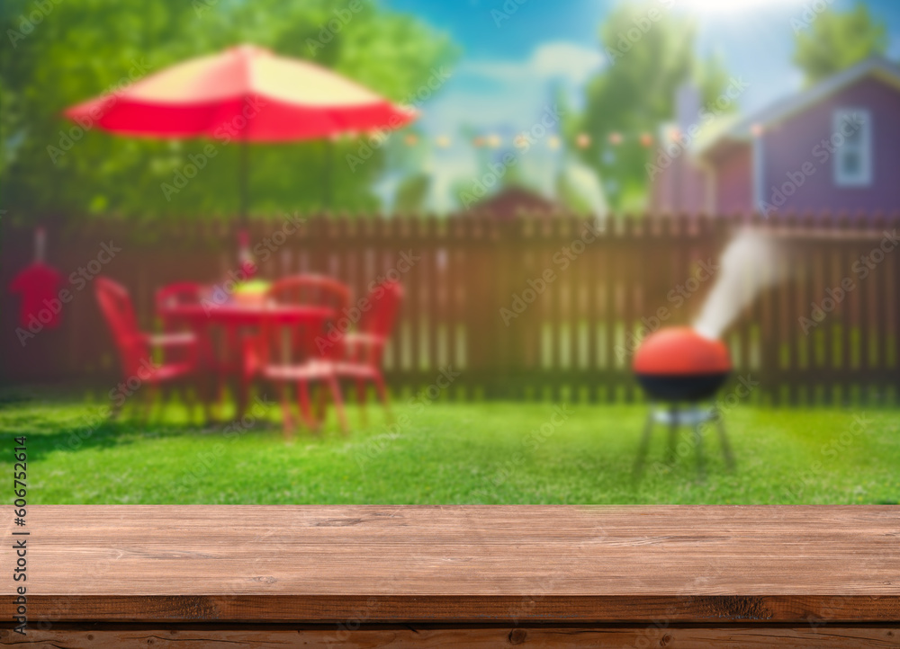 summer time in backyard garden with grill BBQ, wooden table, blurred background
