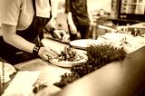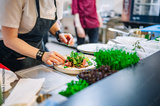 chef hand cooking Roast beef salad with vegetables on restaurant kitchen