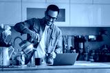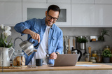 Smiling young businessman pouring hot coffee in cup from kettle while working over laptop on kitchen counter. Cheerful male freelancer making drink while working remotely from home office