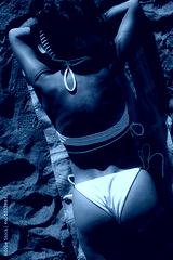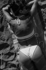brunette girl with glasses in a white swimsuit lies on the sand on the beach