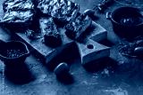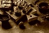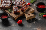 grilled and barbecue ribs pork on a wooden board, banner, menu, recipe place for text, top view