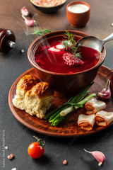 borsch, traditional Ukrainian beetroot soup, Food recipe background. Close up