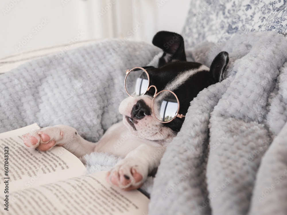 Cute puppy, glasses and old book. Clear, sunny day. Close-up, indoors. Studio photo. Day light. Concept of care, education, obedience training and raising pets