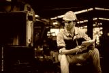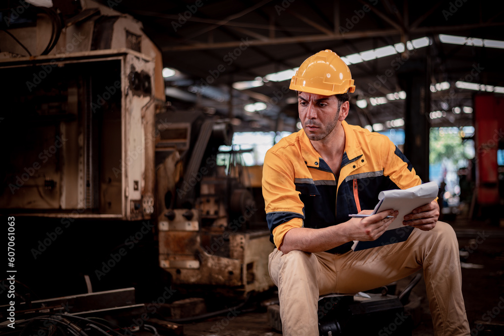 Worker wearing uniform sitting in factory plantation posing feel tried and serious with work ,he holding work document on hand feel high presser situation is failure workplace.