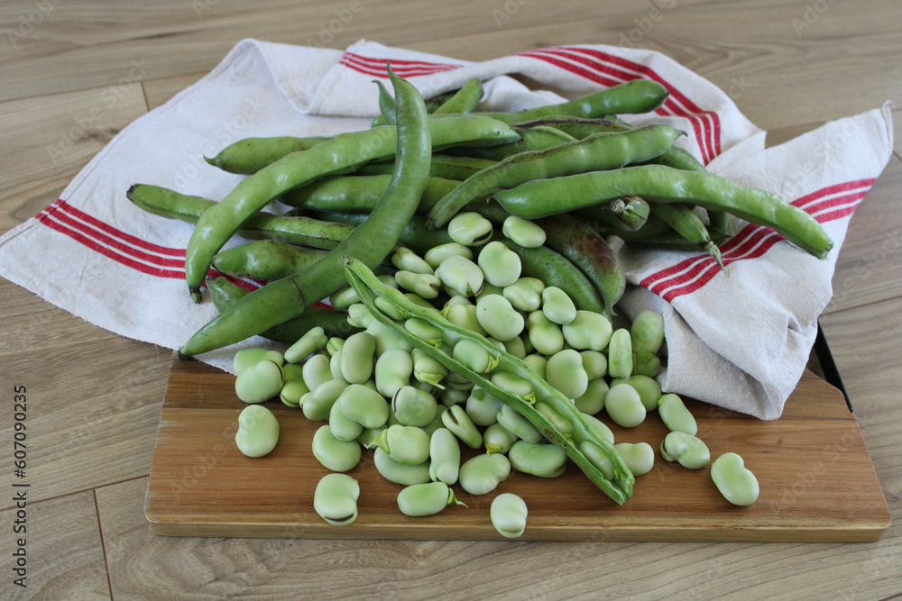 Fèves et cosses de fèves, sur plateau en bois, aliment frais.