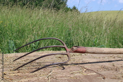 Fourche dans la charrette, champ et ciel bleu en arrière plan, paysage agriculture et terroir de France authentique
