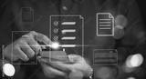 technology, checklist, contract, working, business, management, document, approval, inspections, checkmark. on hand hold smartphone and checklist document. checked mark approval to management inspect.