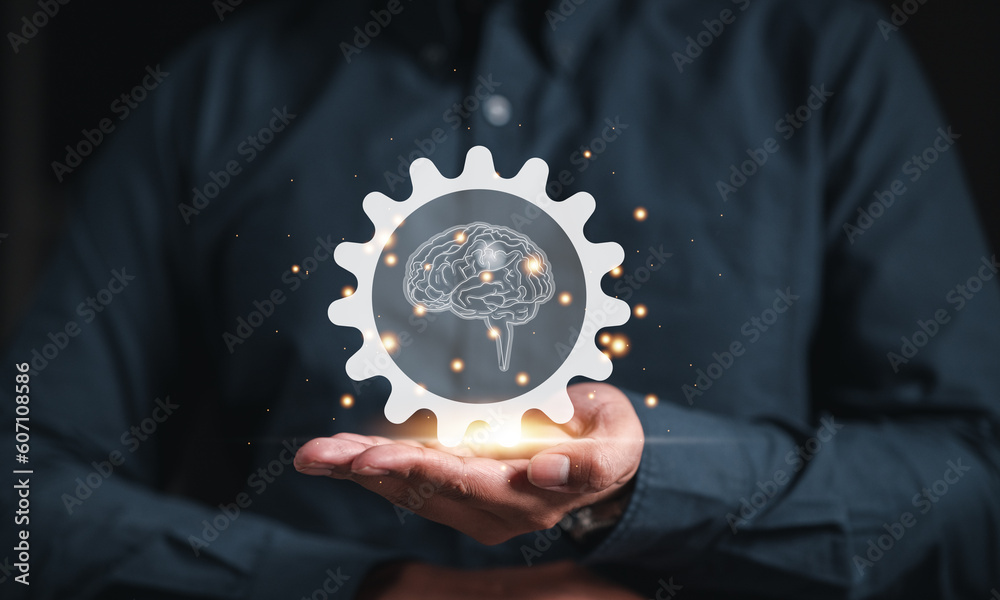 gear, cog, brain, idea, strategy, creativity, information, knowledge, imagination, creative. on hand showing the gear or cog in that's has brain and creativity idea strategy. information knowledge.