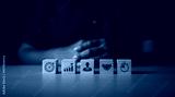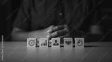 finance, investment, financial, invest, investing, wealth, saving, banking, investor, save. in front a man has cube. that cube have sticker finance investment symbol. wealth saving banking investor.