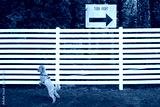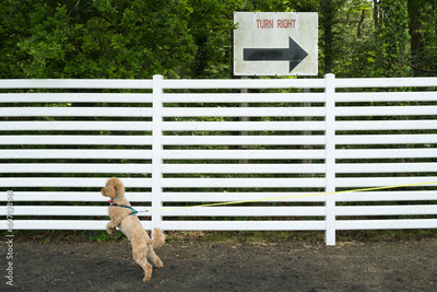 Adult poodle seen ignoring her owner and continue to go left when a direction sign says to got right. Her long hi-viz lead is visible.