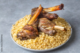Turkish foods; lamb shank tandoori on bulgur wheat rice (Turkish name; bulgur bugday pilavi kuzu incik tandir)