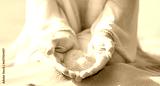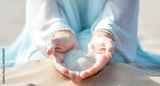 Hands releasing dropping sand. Sand flowing through the hands against blue ocean. Summer beach holiday vacation concept
