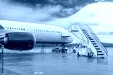 Ladder at the rear entrance of a passenger aircraft, view of the tail and apron of the airport.