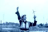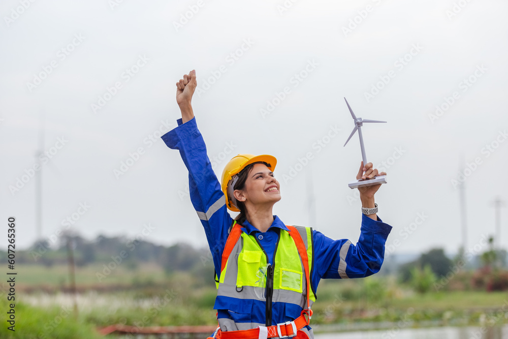 Happy female engineer of wind turbine energy company. woman holding wind turbine simulator. Technology protect environment reduce global warming problems. Innovative renewable energy.