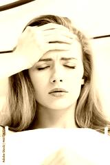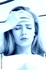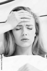 Beautiful casual caucasian woman lying in bed,touching her foreh