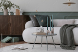 Cozy living room interior with boucle sofa, round coffee table, stylish sideboard, green pillows, plaid, slippers, round carpet and personal accessories. Home decor. Template.